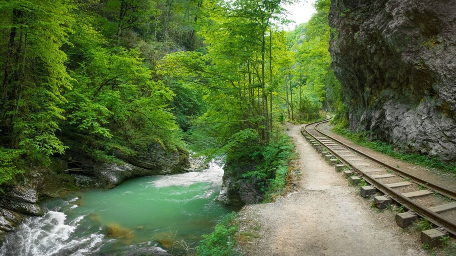 Гуамское ущелье — узкий живописный каньон вдоль реки Курджипс с отвесными стенами высотой до 400 метров. Первая часть пути — на паровозике по узкоколейке (1000 ₽ взр / 800 ₽ дет, по желанию), дальше пешком по живописной тропе около 4–5 км в оба конца. Ущелье красиво в любое время года: весной — водопады, летом — прохлада, осенью — краски.
